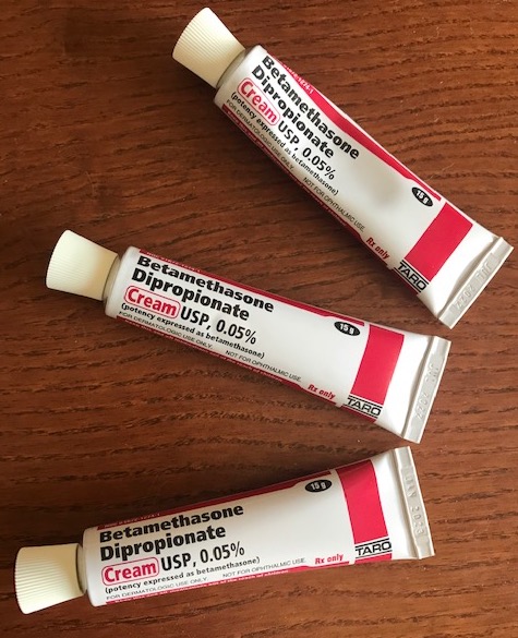 Sometimes the big guns must be marshaled. The dermatologist meeting was quick and to the point. Besides urging me to take antihistamines, the doctor prescribed Betamethasone Dipropionate cream, described as a “strong corticosteroid,” which means, I hope, that it contains healing superpowers of uncommon righteousness. Corticosteroids come with myriad side effect warnings, from acne to glaucoma, but I’m going for it. Besides, I don’t think I’ll get acne or glaucoma on my legs.